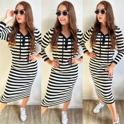 Csíkos maxi pulcsiruha bordázott anyagból, kapucnival, húzózsinórral.