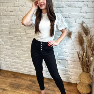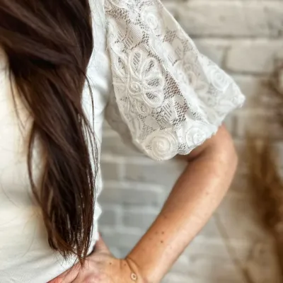 Pamut felső puffos csipkeujjakkal. Rugalmas anyagból készült.Csinos, mégis rendkívül kényelmes darab.