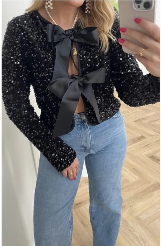 Csillogó flitteres bolero elején csinos szatén masnikkal. Ünnepi alkalmakra varázslatos megjelenést biztosít viselőjének.