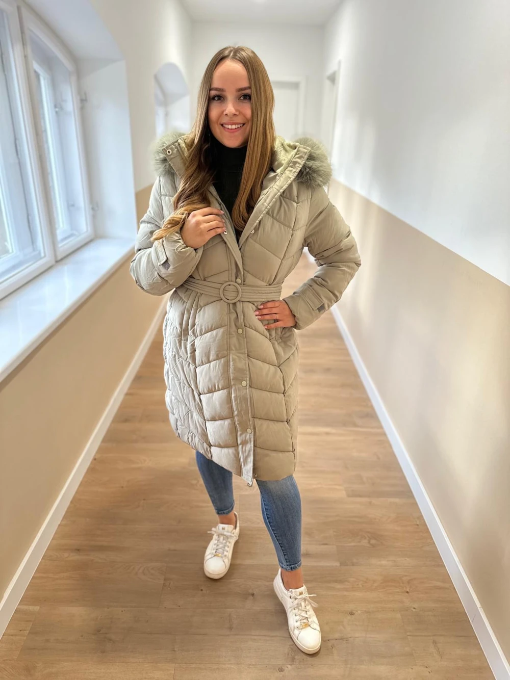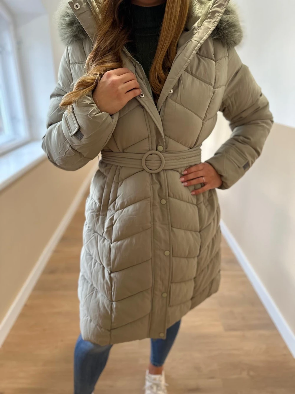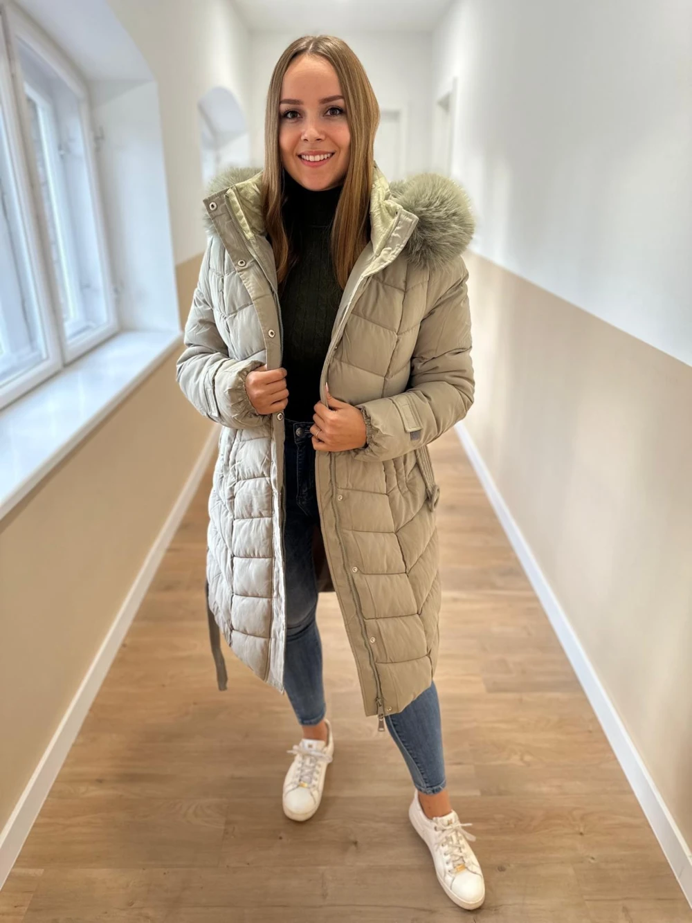 Különleges színű, hosszított vastag kabát.