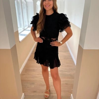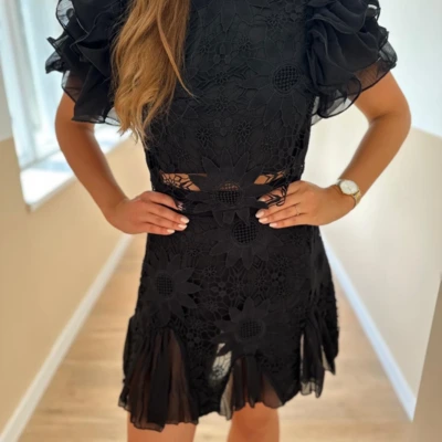 -Felsőjének ujjai fodrosak, horgolt díszítésű, hátán zipzáros