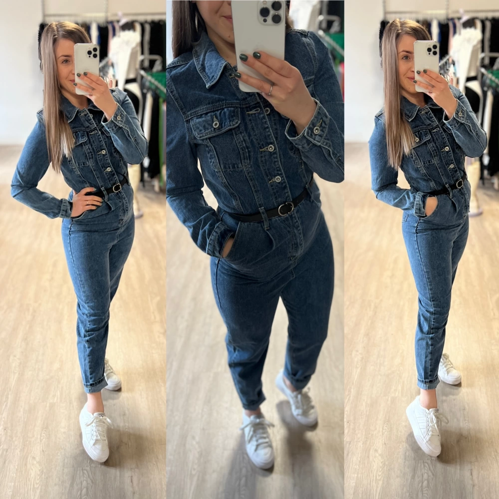 Övvel kiegészített, enyhén szűkített szárú farmer overál.