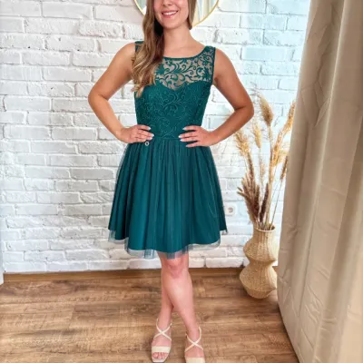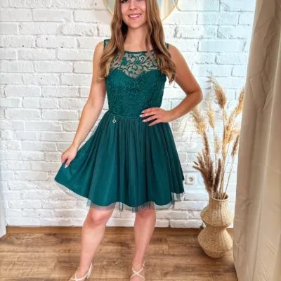 Mesés rövid alkalmi ruha smaragdzöld színben. Felső része csipkemintás, szoknyája többrétegű tüll anyagból készült,ami gyönyörű tartást ad a ruhának.