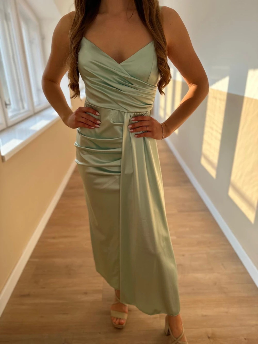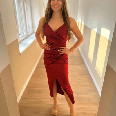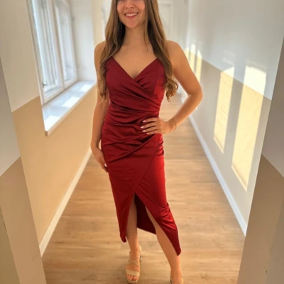 Fényes, szatén anyagú alkalmi ruha, állítható pántrésszel.