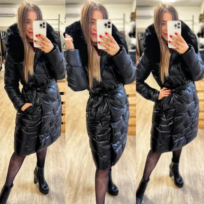 Hosszú fekete télikabi elegáns szőrmés kapucnival. Derekán kötővel karcsúsítható. Zipzár mellett patentokkal is záródik.