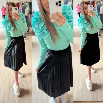 Elegáns, térdig erő, rakott bőrszoknya. Gumis derekának köszönhetően kényelmes viseletet biztosít egy bodyval vagy csinosabb felsővel egyaránt.