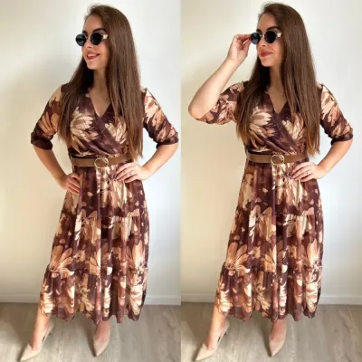 Őszi színekben pompázó V nyakkivágású, virágmintás háromnegyedes ujjú, alján fodrozott ruha.