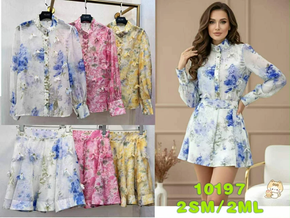 Virágmintás, arany szegecsekkel díszített szett. Felsője ing fazonú 3D virágos. Szoknyája gumis derekú, loknis.