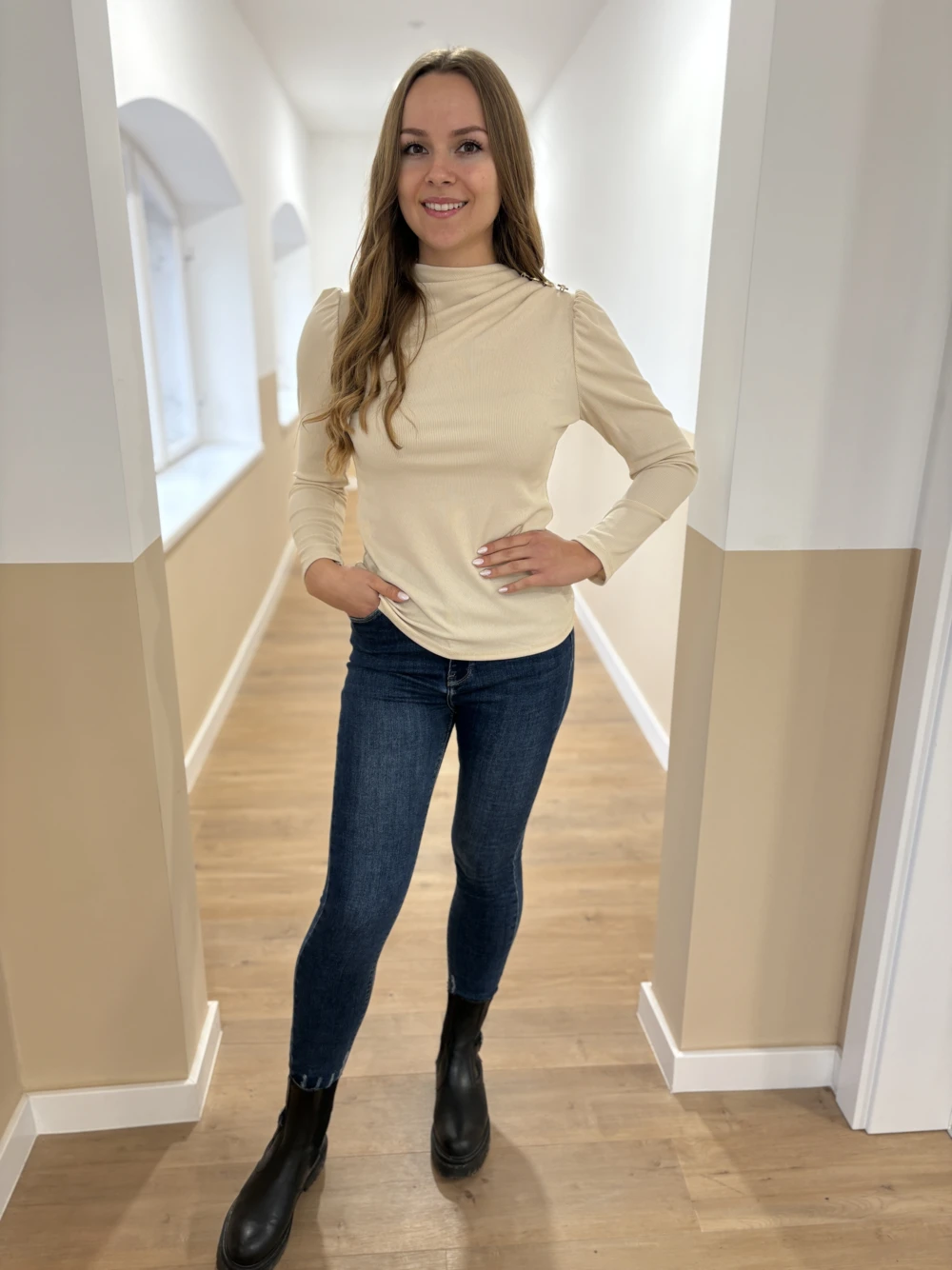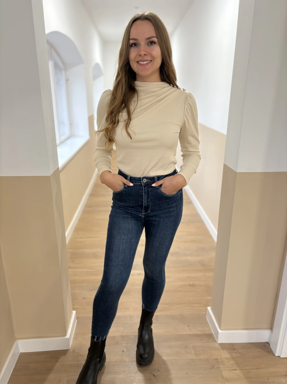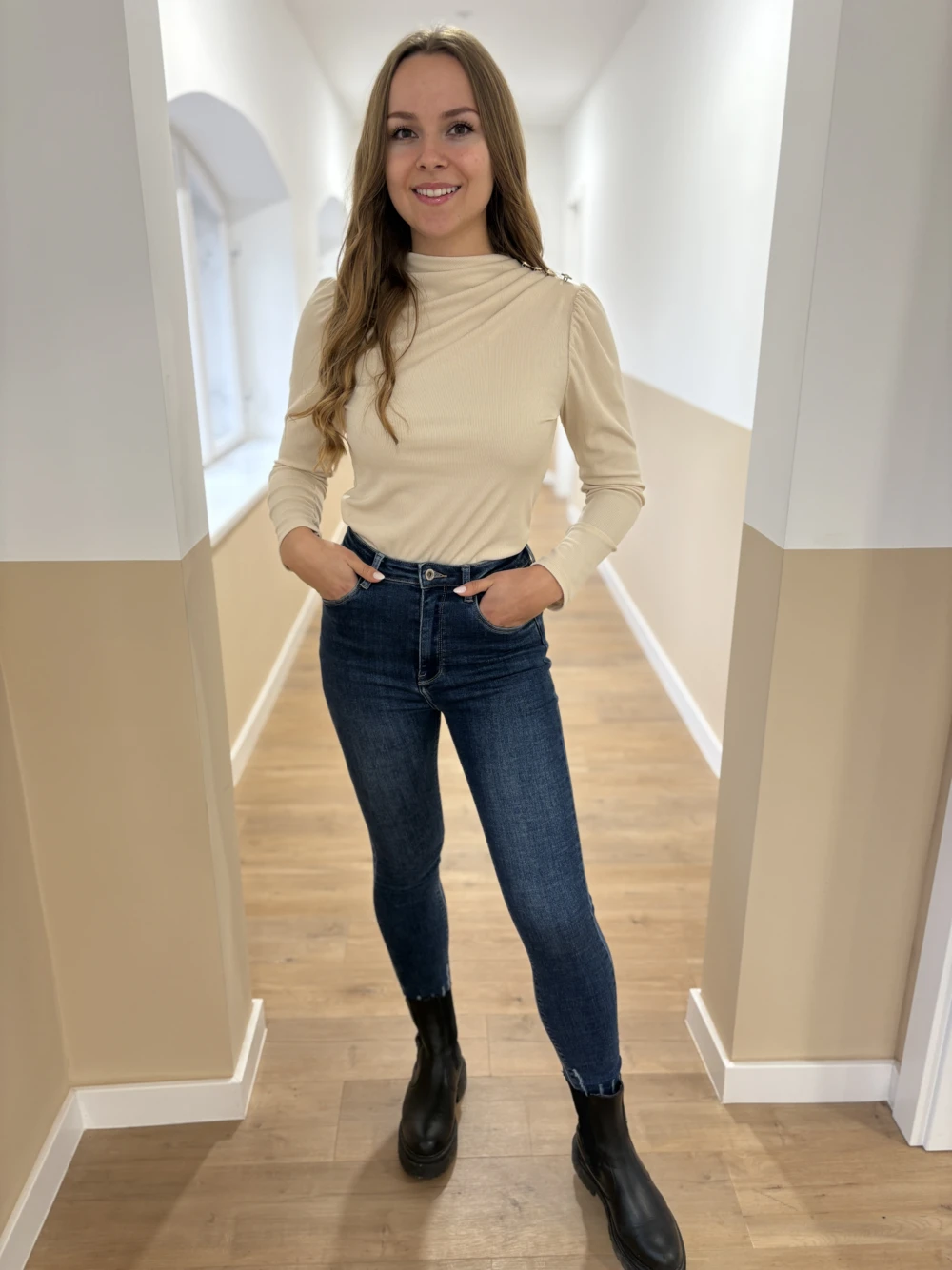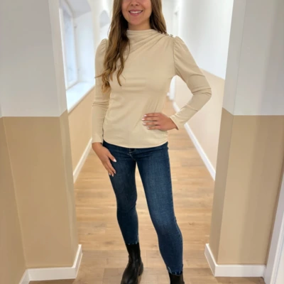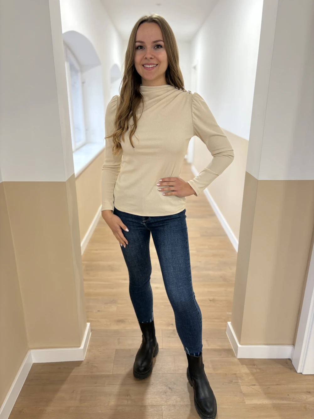 Elegáns felső, csónaknyakkal, arany dísz gombokkal.