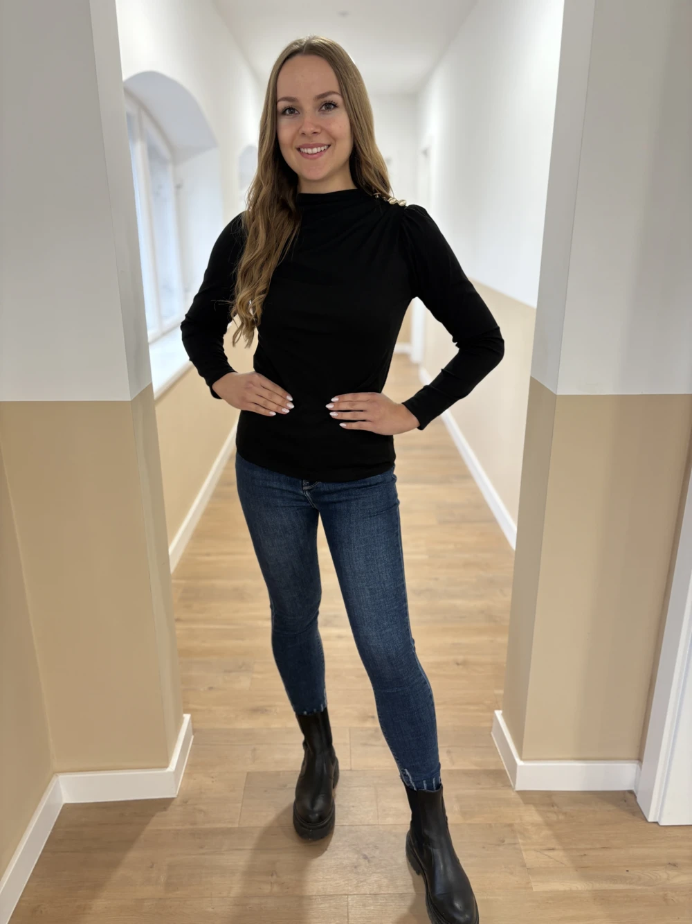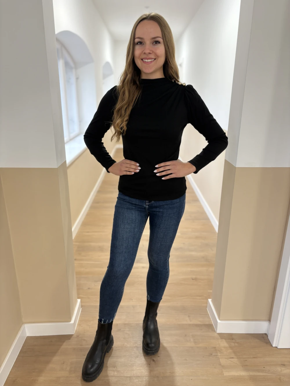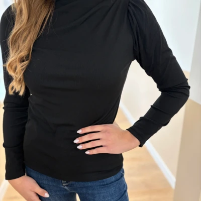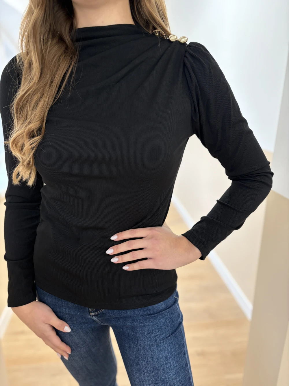 Elegáns felső, csónaknyakkal, arany dísz gombokkal.