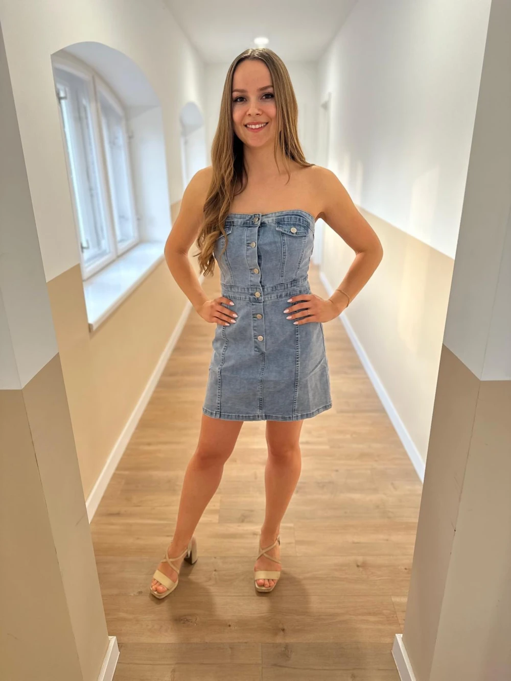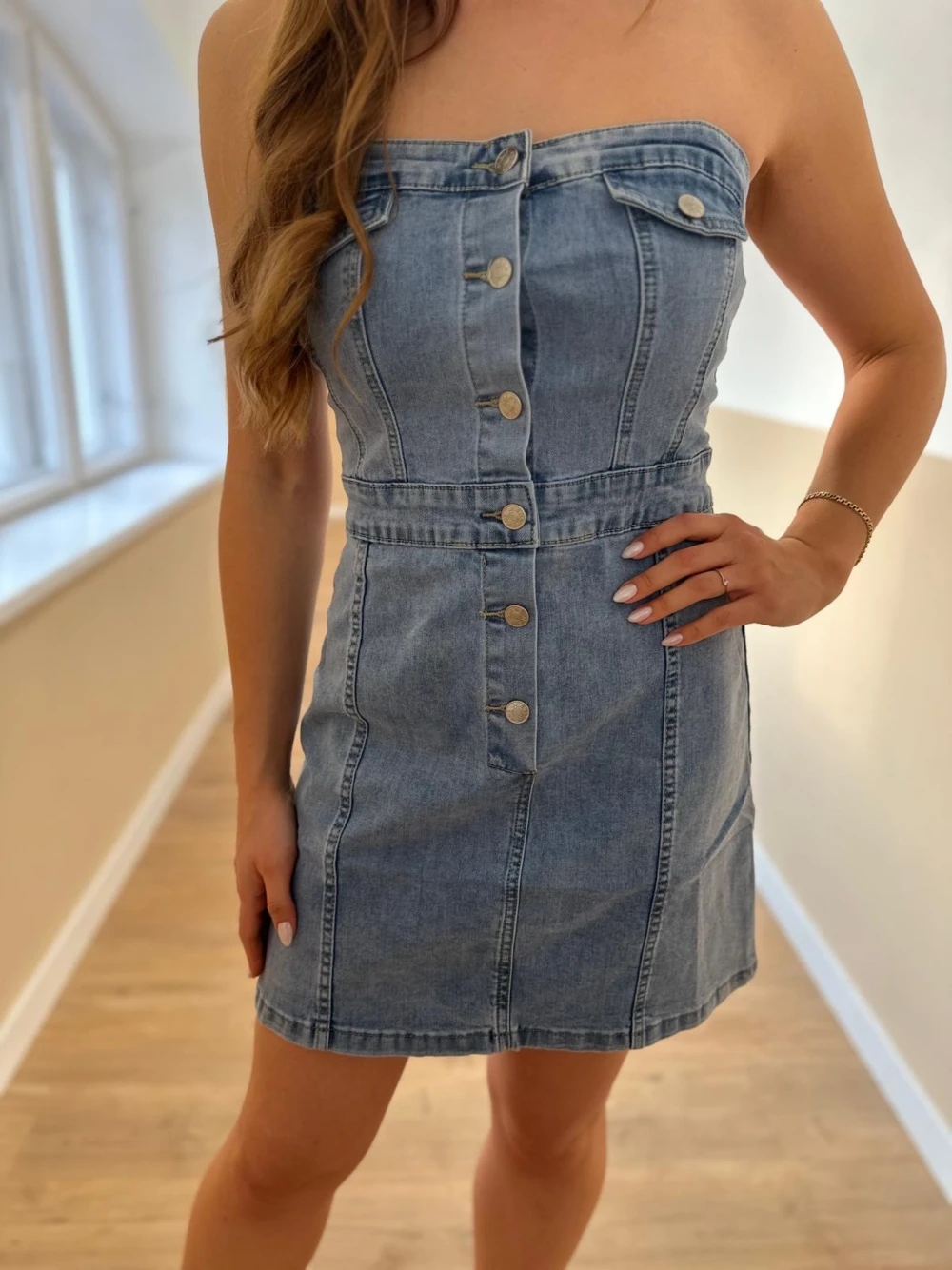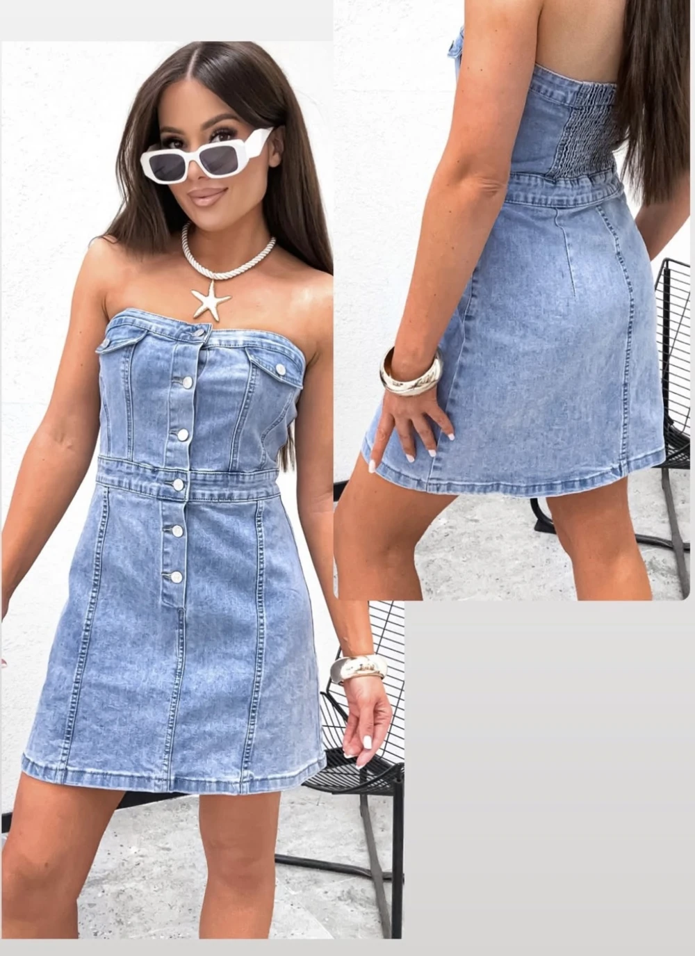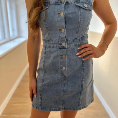 Váll nélküli farmer ruha gombokkal, hátánál gumis.