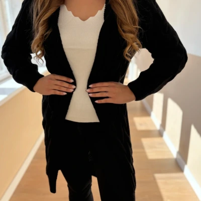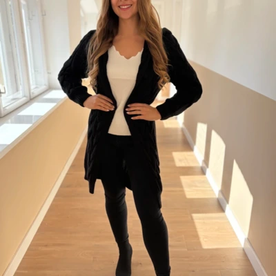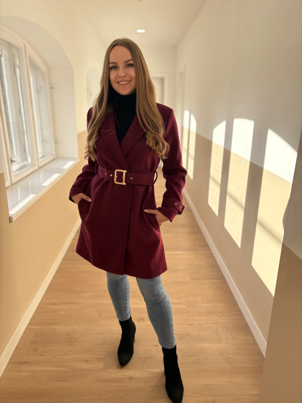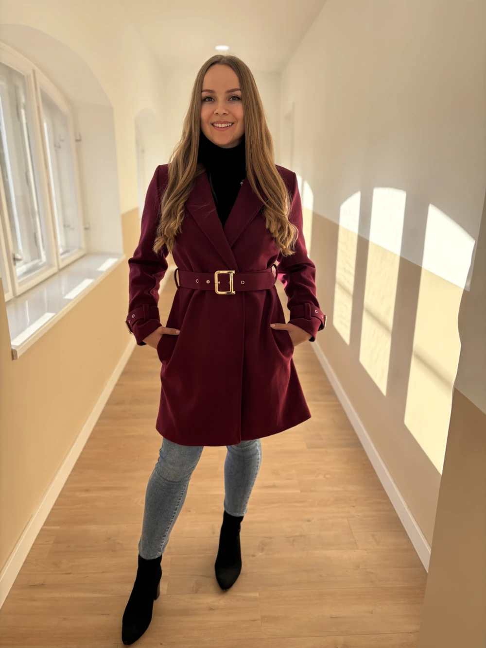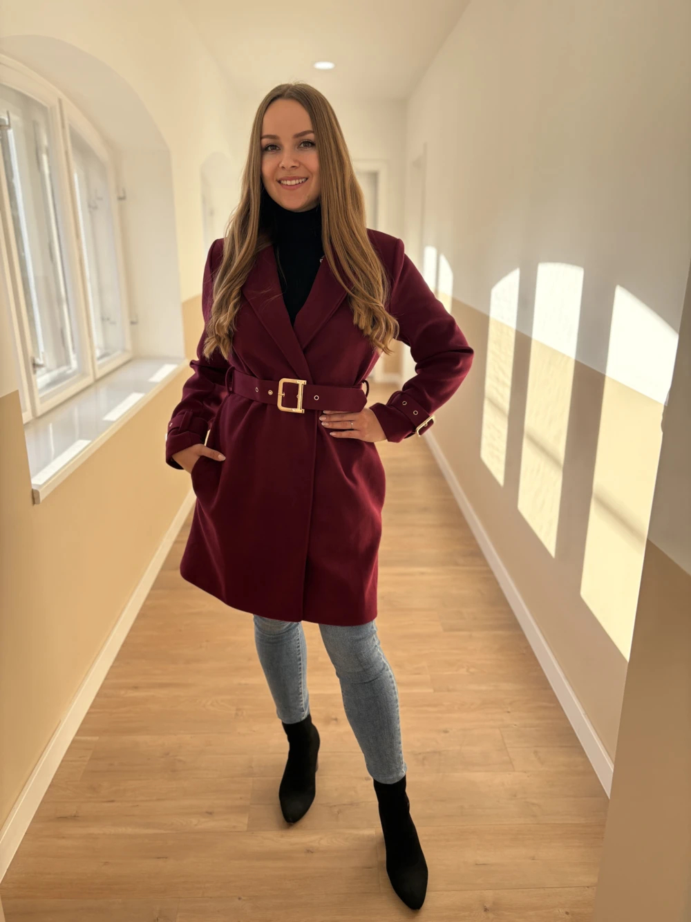 Nőies, csinos szövetkabát divatos színekben. Aranyozott gombokkal, ujjain és derekán övvel díszített darab. Térd alá érő hosszúságú, saját anyagából készült öv tartozik hozzá, mellyel teljesen alakra karcsúsítható.