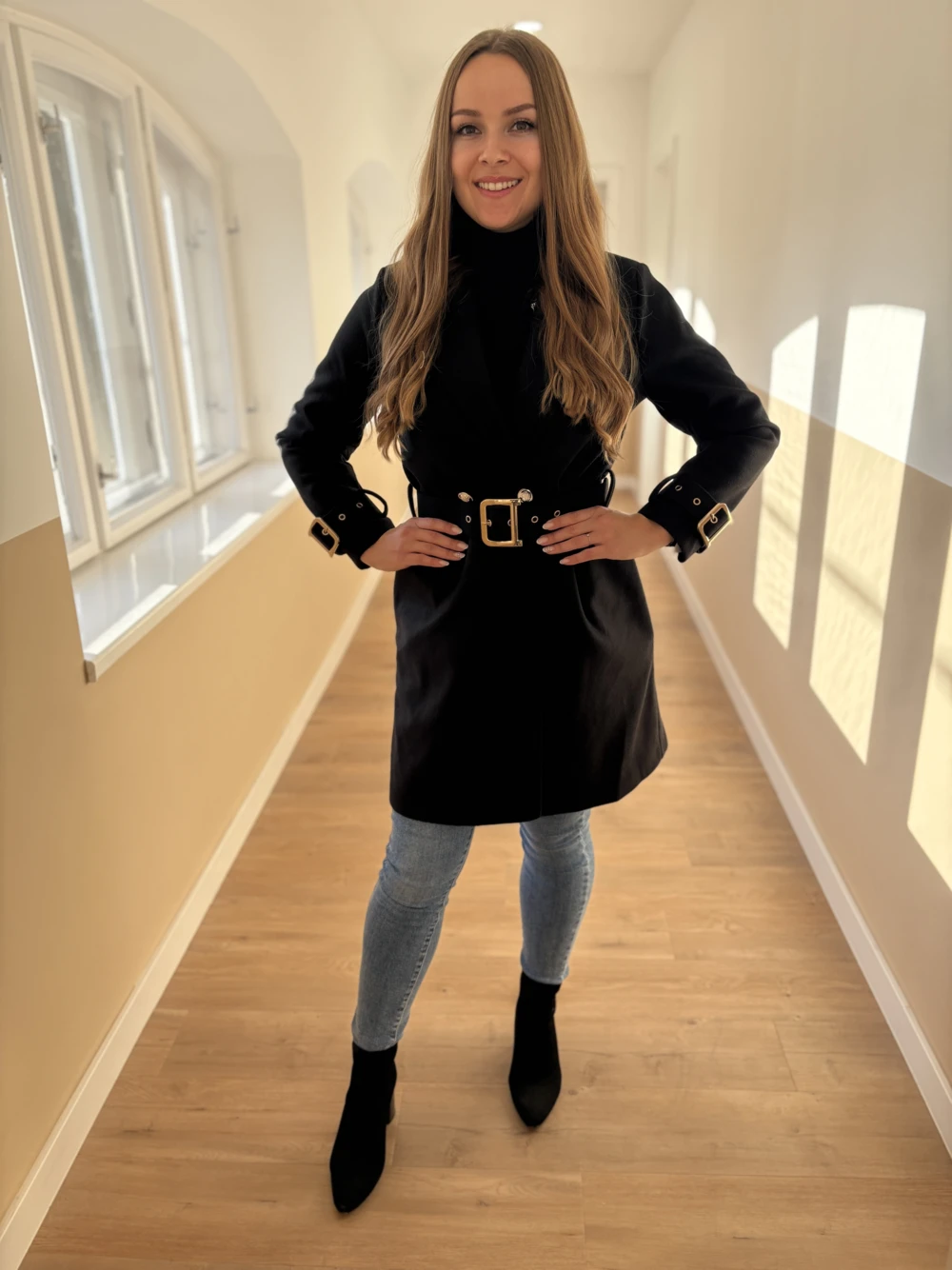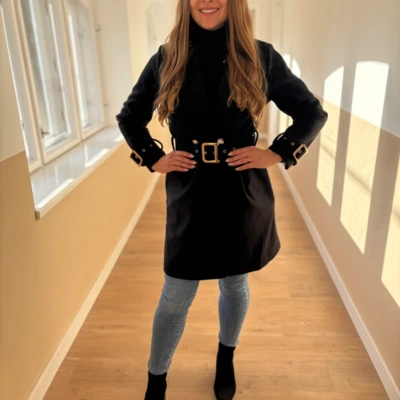 Nőies, csinos szövetkabát divatos színekben. Aranyozott gombokkal, ujjain és derekán övvel díszített darab. Térd alá érő hosszúságú, saját anyagából készült öv tartozik hozzá, mellyel teljesen alakra karcsúsítható.