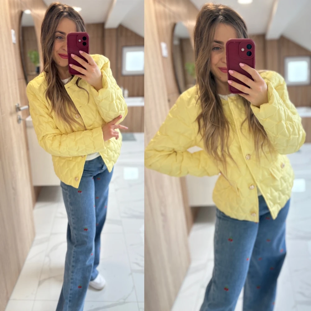 Tavaszi színes, steppelt kabát arany gombokkal.