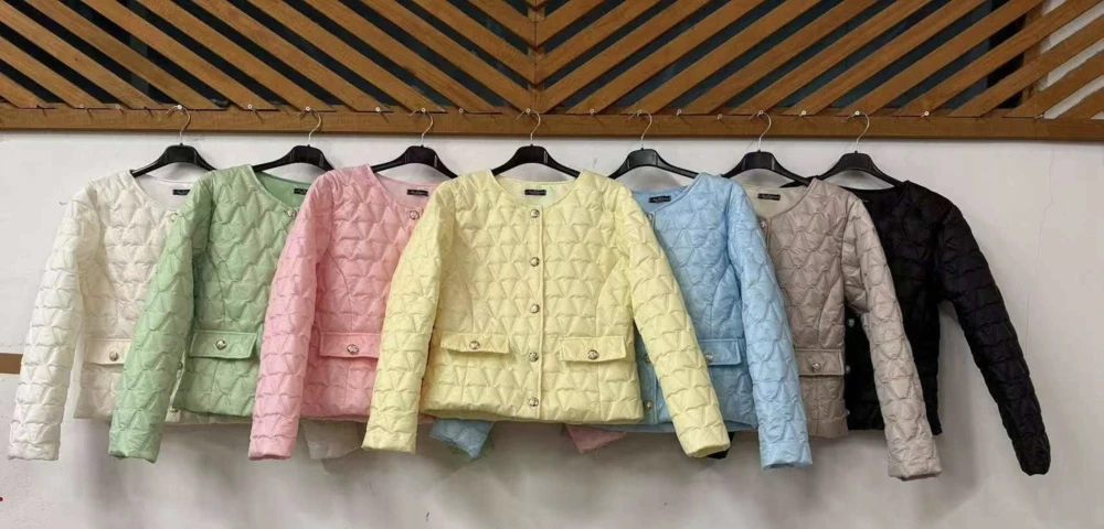 Tavaszi színes, steppelt kabát arany gombokkal.