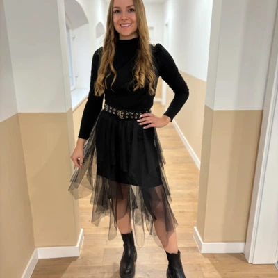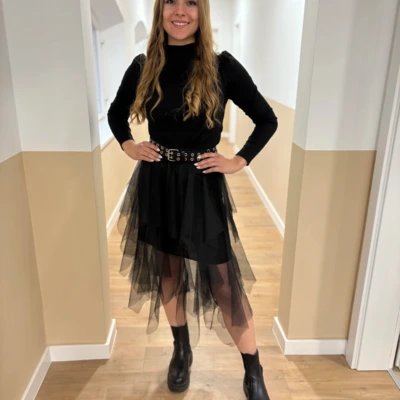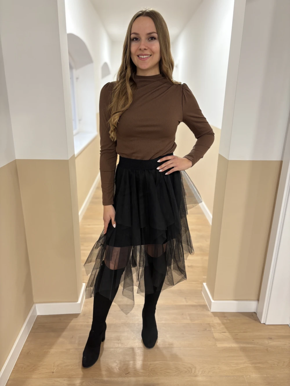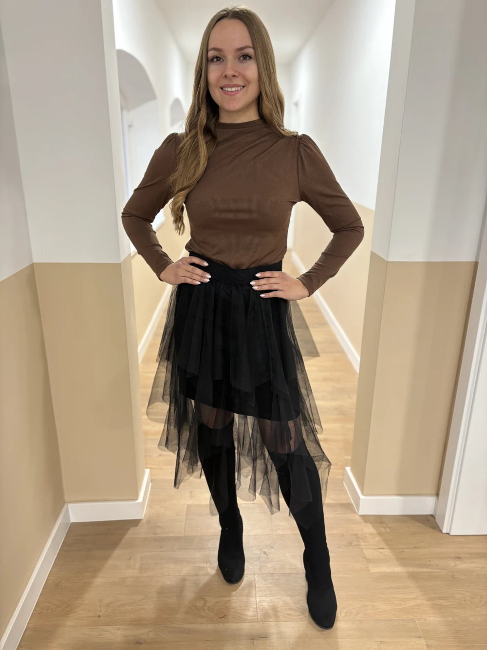 Gumírozott derekú, különleges szabású tüll szoknya.