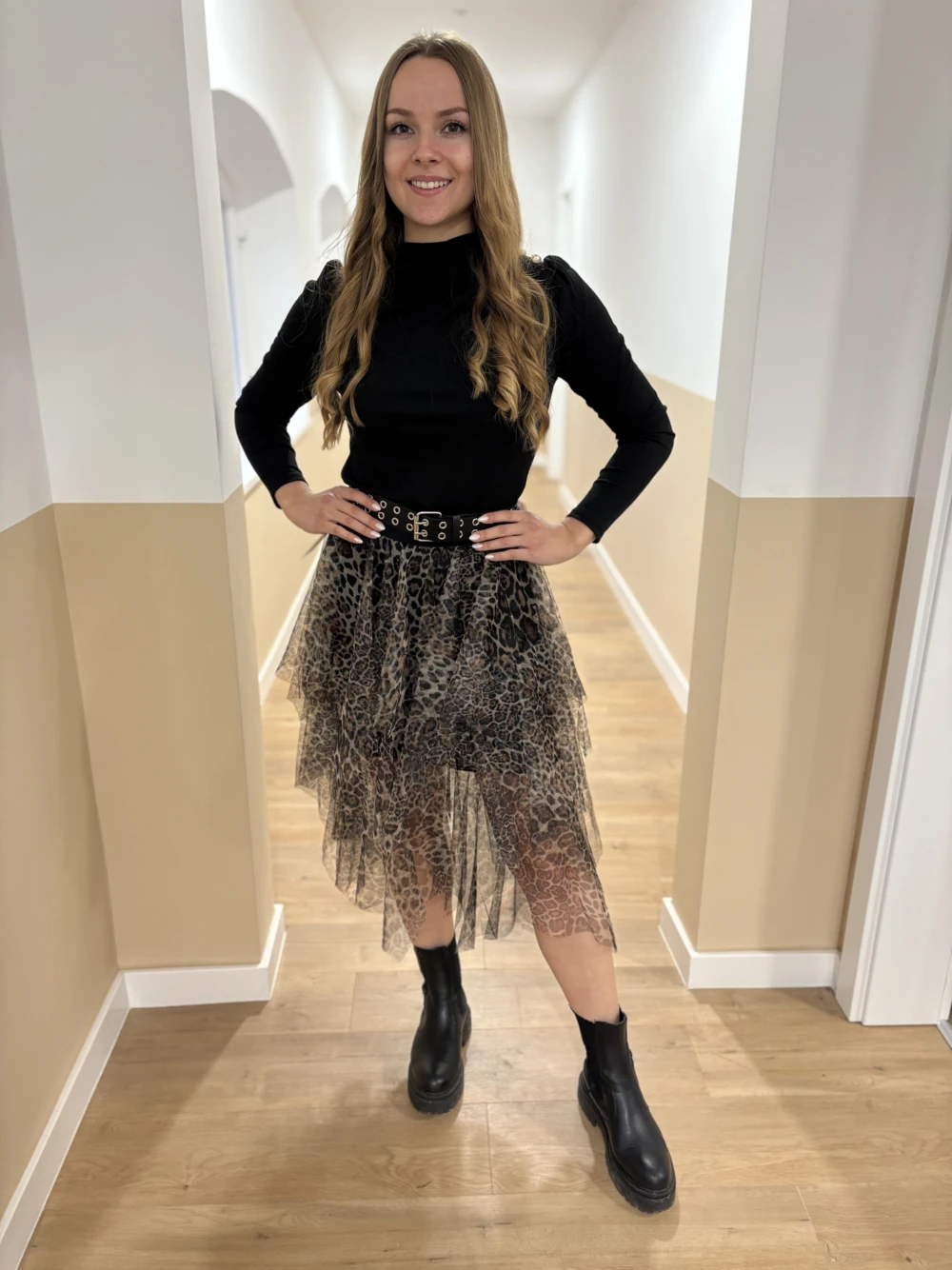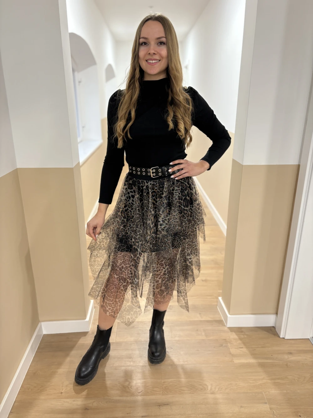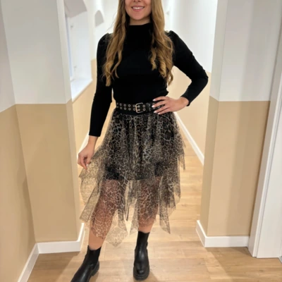 Gumírozott derekú, különleges szabású tüll szoknya.