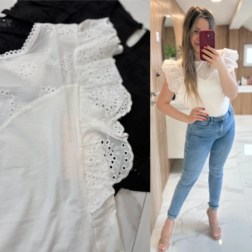 Csipkés, fodros ujjú felső.
