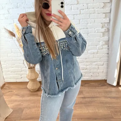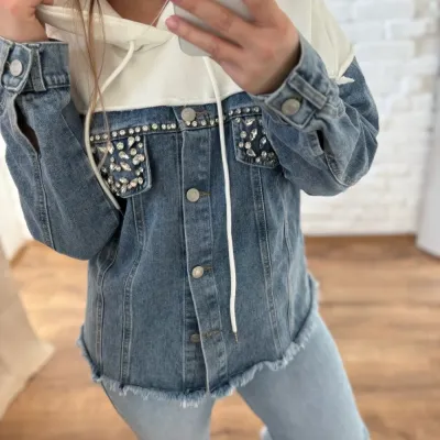 Extravagáns kapucnis pulcsi farmer betéttel és csillogó kövekkel díszítve