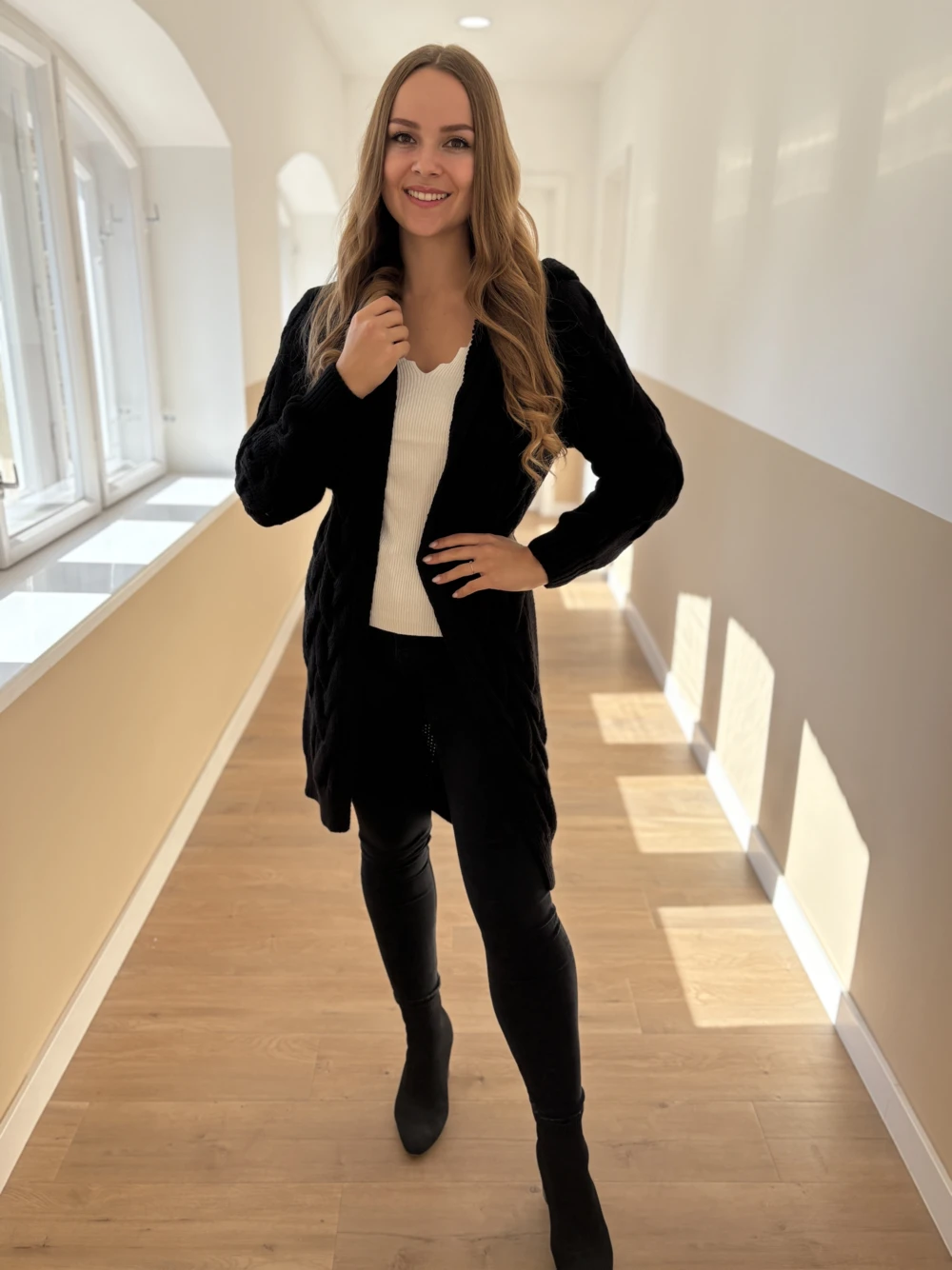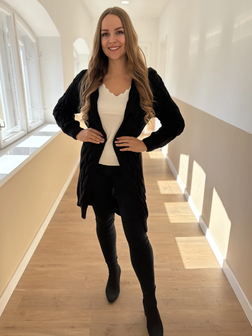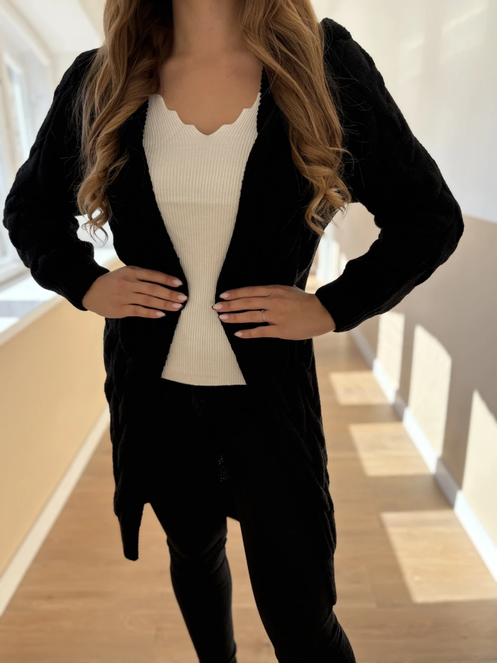 Extra vastag kötött kardigán a hűvös téli hétköznapokra. Mintás kötéssel készült, kapucnis fazon.