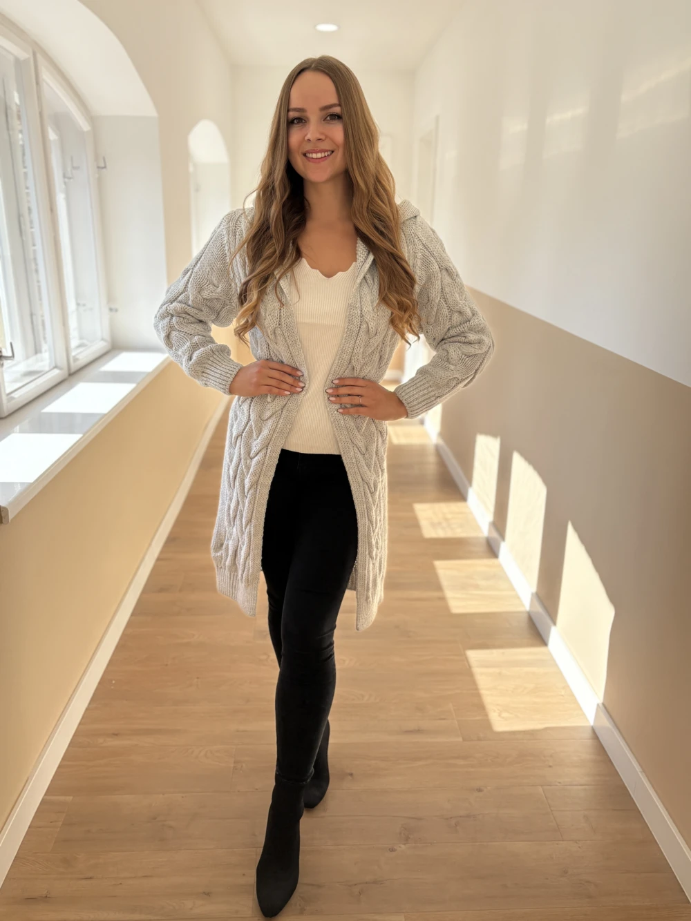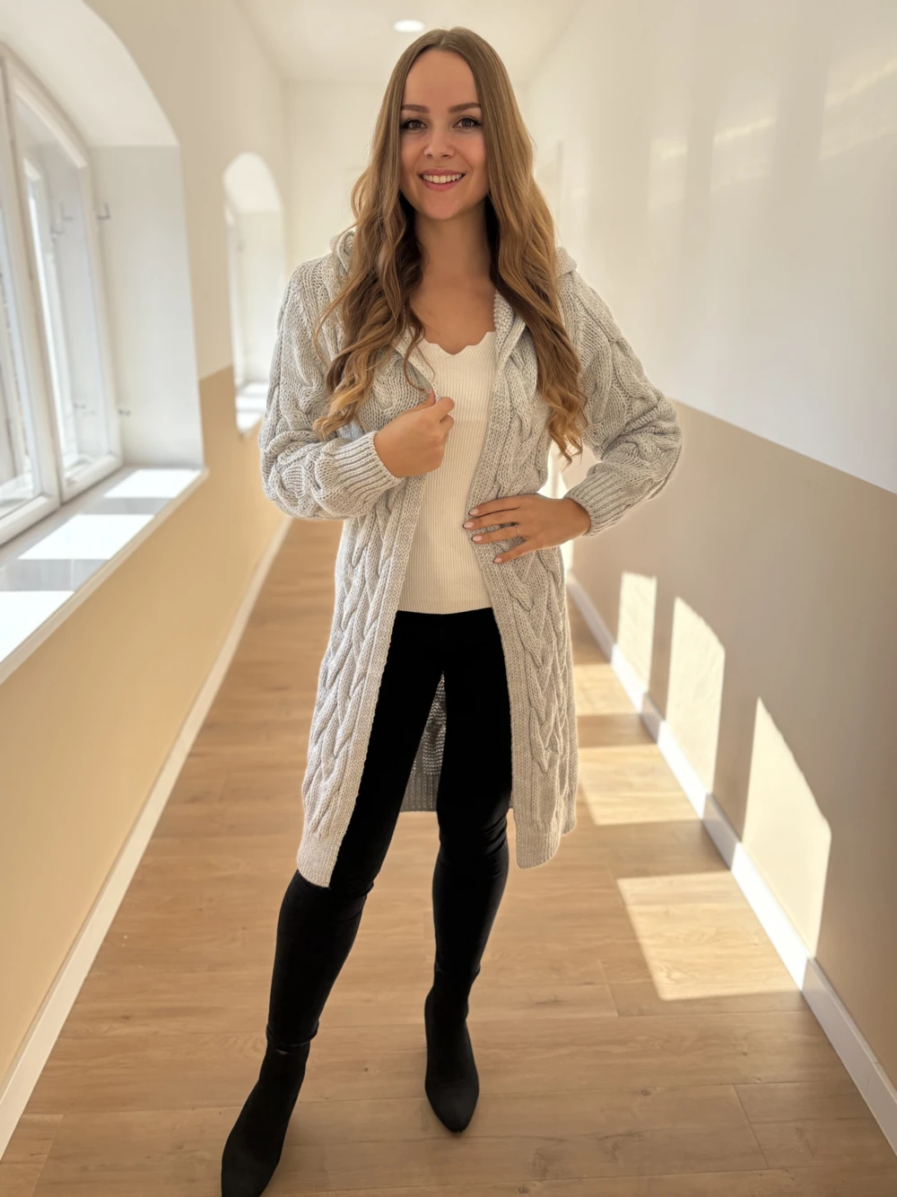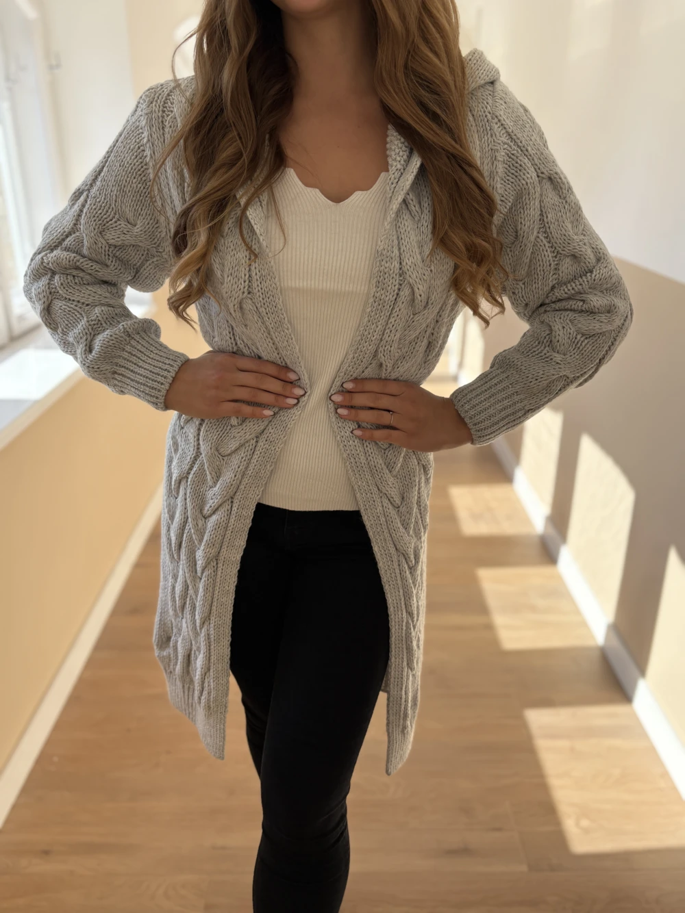 Extra vastag kötött kardigán a hűvös téli hétköznapokra. Mintás kötéssel készült, kapucnis fazon.