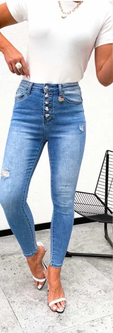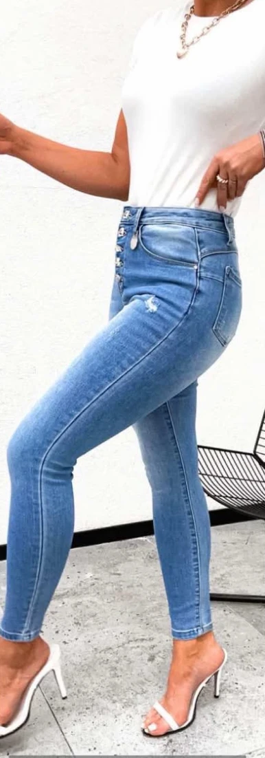 Szaggatott világoskék farmer, szivecskés gombokkal.